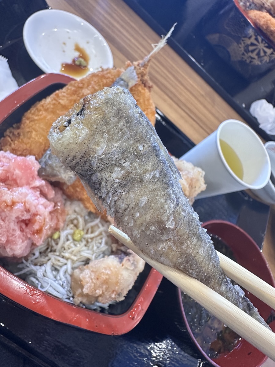 あじフライに、いわき市の魚 めひかりの唐揚げ、げそ揚げ、しらす、ねぎとろという盛りだくさんの丼。