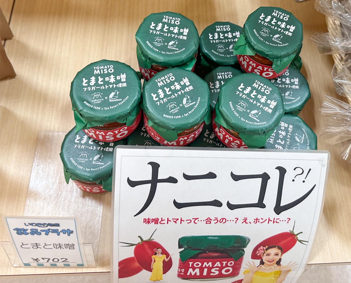 いわき市内で有名なトマト農家「ワンダーファーム」の「とまと味噌」です。使われているのは「フラガールトマト」。とにかくさまざまな料理に使えるので、私はいわき・ら・ら・ミュウやスパリゾート・ハワイアンズに行く度に買っています。