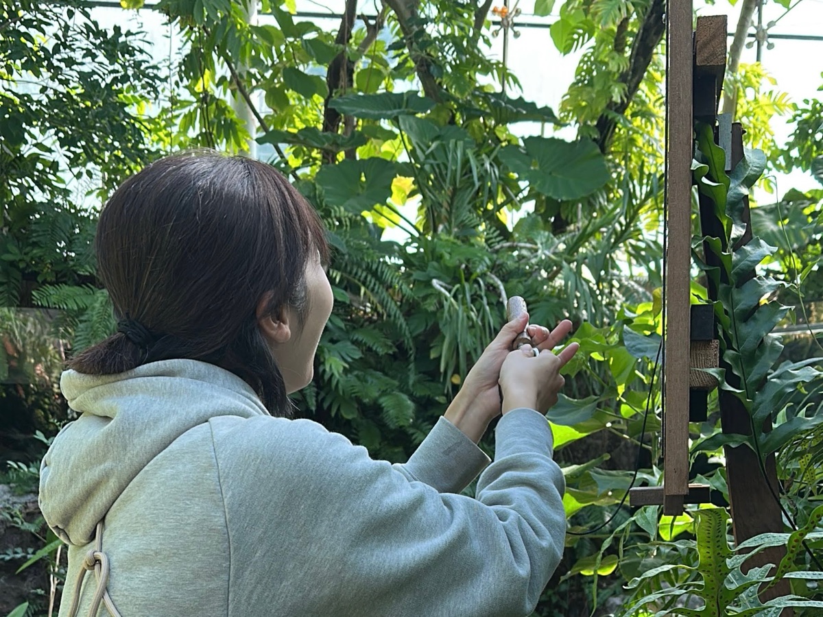 熱帯アジアの展示コーナーでは、木製の玩具のようなもので鳥の鳴き声を出すことができます。それによってホンモノの鳥と会話することも。
