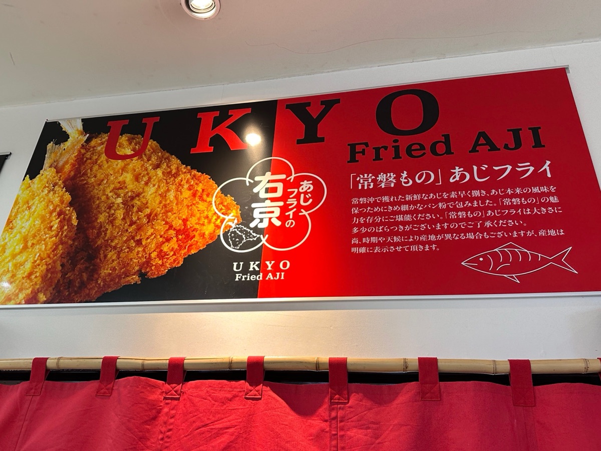 迷いましたが、新しくオープンしたお店「あじフライの右京」に決めました!こちら2025年9月にグランドオープンしたお店だそう。でもお店のお父さんと話した内容からすると、地元で長く魚関係のことをされている方だと感じました。時間がなく詳しくは伺えなかったのですが、昔からのいわきのことをご存知でした。