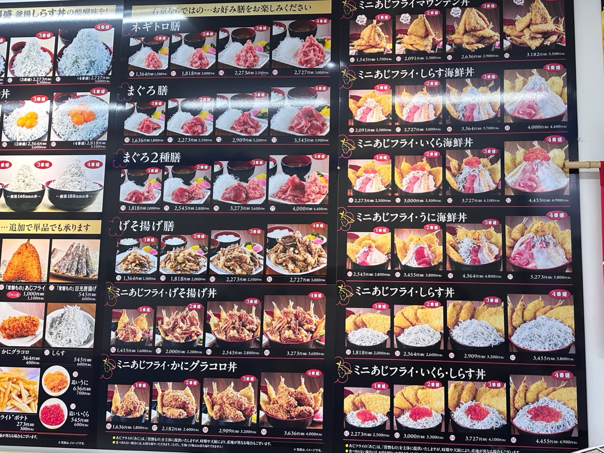 あじフライの右京は店の前にメニューが張り出されています。このメニューでも迷います。デカ盛り丼も各種あるので、胃袋が巨大な人でも満足できるはず!